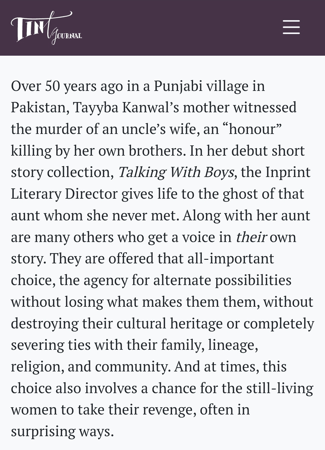 A book review of Talking with Boys by Tayyba Kanwal for Tint Journal (January 5, 2026)